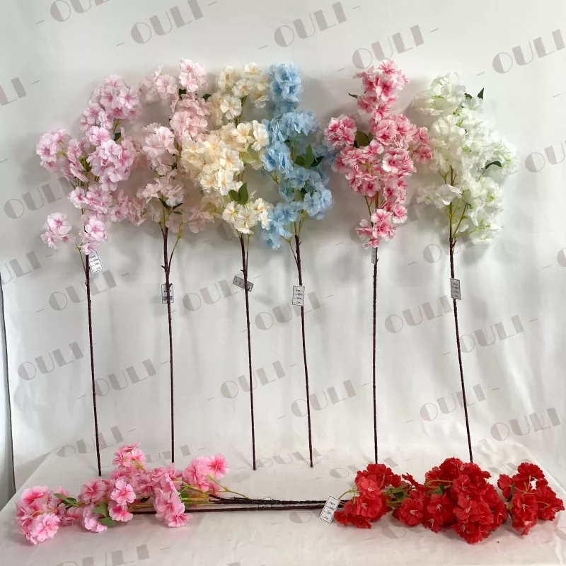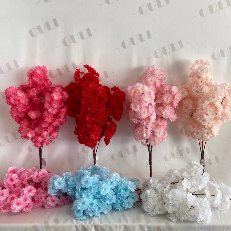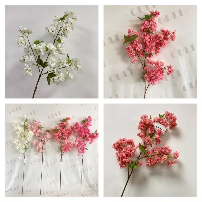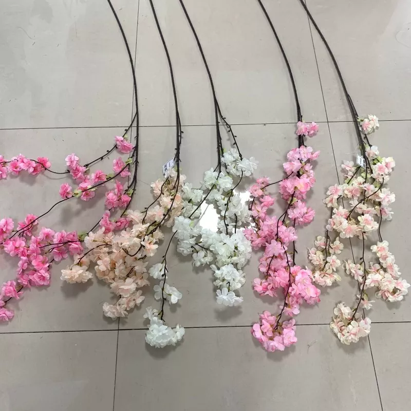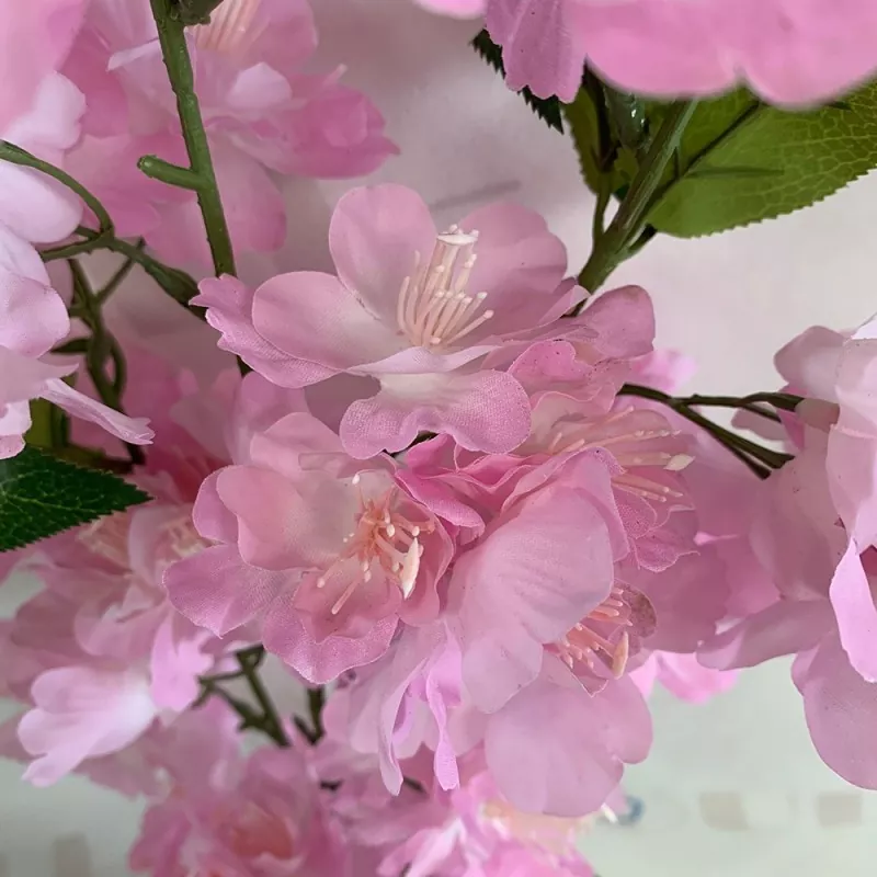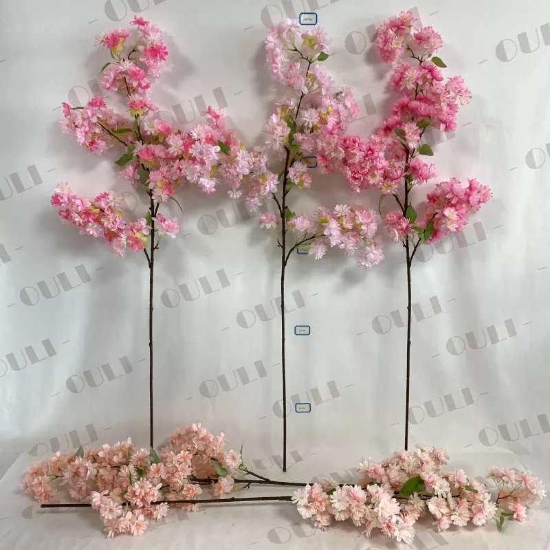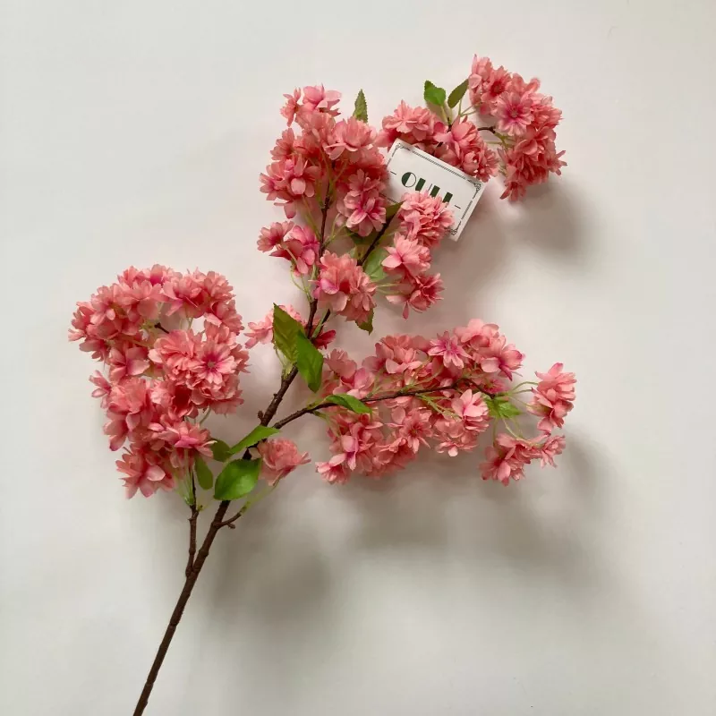 Keinotekoisissa kirsikankukka-oksissa on kolme kerrosta silkkilehteitä, vaaleanpunaisia ​​kärjessä, viiden haaroitettuja oksia ja neljä sarjaa vihreitä lehtiä. Seisotaan noin 63 cm (noin 2 tuumaa) pitkä, se sopii moniin asetuksiin, mukaan lukien kodinsisustus ja häät.