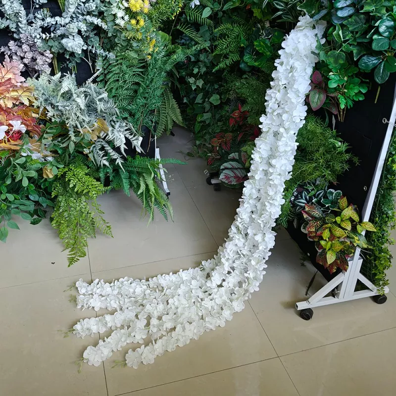 Tämä keinotekoinen Wisteria-kukat seppele on 180 cm pitkä, erityisen pitkä tyyli. Jos sitä käytetään pareittain, se voi peittää huoneen koko korkeuden.